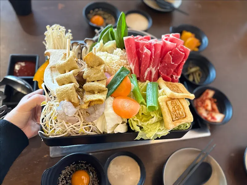 자리에 앉아 메뉴를 펼쳐 들었습니다. 다양한 육수 옵션들이 눈에 띄었는데, 그중에서도 반반 육수를 선택할 수 있다는 점이 특히 매력적이었습니다. 매운맛과 순한맛, 두 가지 매력을 동시에 경험할 수 있다는 생각에 망설임 없이 반반 육수를 주문했습니다. 잠시 후, 테이블 위에는 다채로운 색감의 야채와 신선한 고기가 정갈하게 담긴 트레이가 놓였습니다. 붉은빛을 뽐내는 소고기와 우삼겹, 그리고 오리고기까지 선택할 수 있다는 점이 인상적이었습니다. 저는 소고기와 우삼겹을 선택했습니다.