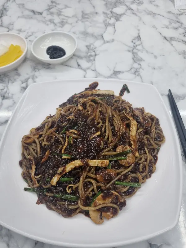 곧이어 쟁반짜장이 등장했는데, 비주얼부터 압도적이었어. 커다란 접시에 가득 담긴 쟁반짜장은 윤기가 좔좔 흐르고, 해물도 아낌없이 들어가 있더라. 새우, 오징어, 홍합 등 해산물이 진짜 푸짐하게 들어있어서 골라 먹는 재미도 있었어. 면도 탱글탱글하고, 짜장 소스도 너무 달거나 짜지 않고 간이 딱 맞았어. 특히 불맛이 은은하게 느껴지는 게 신의 한 수! 젓가락을 멈출 수 없는 마성의 맛이랄까?