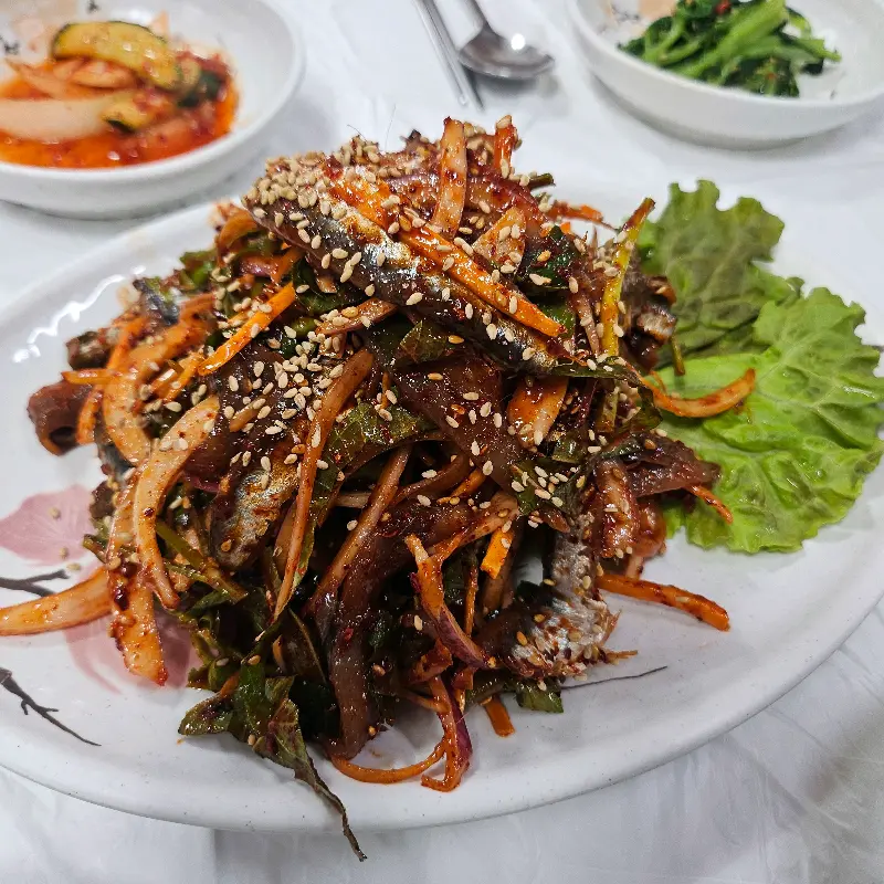잠시 후, 테이블 위로 펼쳐지는 멸치들의 향연! 멸치회무침, 윤기 좔좔 흐르는 비주얼에 정신 혼미. 젓가락으로 쉐킷쉐킷 비벼서 한 입 딱 먹는 순간, Yo! 감칠맛 폭발! 새콤달콤한 양념과 신선한 야채, 그리고 멸치의 조화가, 이건 완전 미친 콜라보! 술 안주로 딱이겠는데? 아쉽지만 오늘은 쌈밥에 집중하기로.