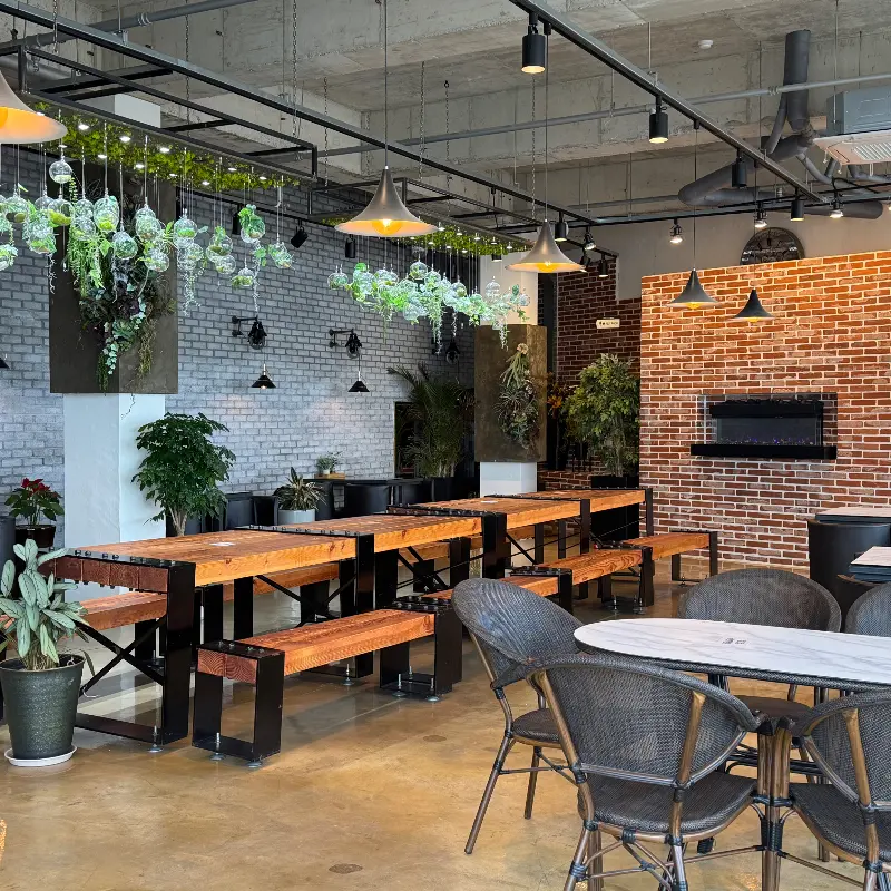 카페 외관은 생각보다 소박했지만, 문을 열고 들어서는 순간, 감탄사가 절로 터져 나왔다. 넓은 공간과 층고, 그리고 통창 너머로 펼쳐지는 푸른 바다가 한눈에 들어왔다. 에서 볼 수 있듯, 천장에 드리워진 화초 장식은 실내에 생기를 불어넣고, 마치 자연 속에서 커피를 마시는 듯한 느낌을 선사했다. 인테리어에 사용된 다양한 질감의 벽돌은 시각적인 풍요로움을 더하며, 공간 전체에 따뜻하고 아늑한 분위기를 조성했다.