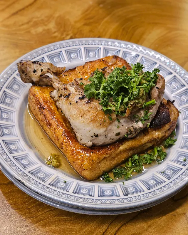 프토닭: 헤미안 브런치바의 시그니처 메뉴인 프토닭은 겉바속촉의 정석을 보여주는 프렌치토스트 위에 촉촉한 닭다리살이 얹어져 나오는 메뉴다. 빵은 겉은 바삭하게 캐러멜화되어 달콤하면서도 고소한 맛을 내고, 속은 촉촉하고 부드러워 입안에서 살살 녹는다. 닭다리살은 잡내 없이 향긋한 풍미를 자랑하며, 빵과 환상적인 조화를 이룬다. 달콤한 프렌치토스트와 짭짤한 닭다리살의 단짠 조합은 정말 멈출 수 없는 맛이다. 사진에서 보이는 것처럼, 닭다리살 위에는 파슬리 가루가 솔솔 뿌려져 있어 시각적인 즐거움까지 더한다. 가격은 22,000원이다.