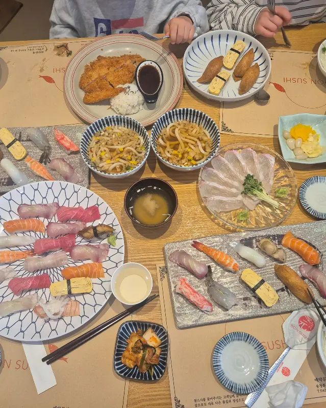 자리에 앉자마자 메뉴판을 정독하기 시작했어. 뭘 먹어야 잘 먹었다고 소문이 날까… 고민 끝에, 시그니처 메뉴인 ‘원 모둠 초밥’이랑 요즘같이 쌀쌀한 날씨에 딱 어울리는 ‘알탕’, 그리고 아이들을 위한 ‘수제 돈까스’를 주문했어. 메뉴 고르는 데만 10분은 족히 걸린 듯 😅.