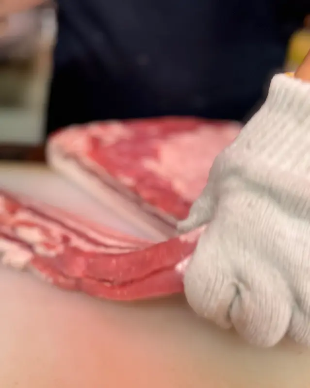 드디어 기다리고 기다리던 삼겹살과 항정살이 등장했다. 선홍색의 삼겹살은 지방과 살코기의 비율이 완벽했으며, 칼집이 섬세하게 들어가 있어 시각적인 아름다움까지 더했다. 지방의 흰색은 빛을 반사하여 더욱 신선하게 보였다. 항정살은 특유의 마블링이 예술적이었다. 근섬유와 지방이 촘촘하게 교차하는 모습은 마치 대리석을 연상시켰다.