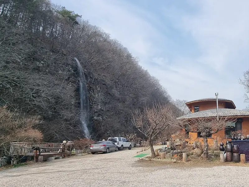 굽이굽이 이어진 길을 따라 차를 몰아 도착한 ‘무릉도원’은, 이름처럼 속세를 벗어난 듯한 고즈넉한 분위기를 풍기고 있었습니다. 넓은 주차장에 차를 대고 내리니, 가장 먼저 눈에 들어온 것은 시원하게 쏟아지는 인공 폭포였습니다. 웅장한 물줄기가 쏟아져 내리는 모습은 그 자체로 장관이었고, 폭포 소리는 마치 자연이 속삭이는 듯 청량하게 귓가를 간지럽혔습니다. 아쉽게도 제가 방문했을 때는 양수기 고장으로 인해 폭포의 완전한 모습을 볼 수는 없었지만, 그럼에도 불구하고 주변 풍경은 충분히 아름다웠습니다. 마치 오랜 세월 그 자리를 지켜온 듯 굳건하게 서 있는 거대한 단풍나무와, 그 아래 놓인 정자는 한 폭의 그림 같았습니다.
