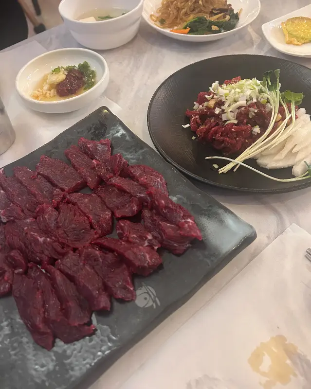 푸짐한 한 상 차림을 보니, 마치 잔칫날에 온 것 같은 기분이었다. 뭉티기, 육회, 오드레기, 밑반찬까지… 어느 하나 빠지는 것 없이 완벽한 조합이었다.