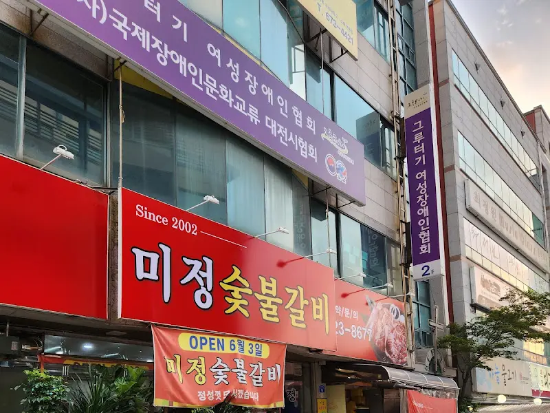 퇴근하자마자 냅다 달려갔지. 낡은 건물 2층에 자리 잡은 “미정숯불갈비” 간판이 왠지 모르게 맛집 포스 뿜뿜하더라? Since 2002라니…20년 넘은 찐맛집이잖아. 입구부터 느껴지는 세월의 흔적, 이거 완전 기대감 폭발하는 각! 문을 열자마자 후끈한 숯불 향이 코를 찌르는데, 아… 진짜 제대로 찾아왔구나 싶었다.
