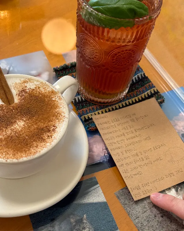 드디어 기다리고 기다리던 음료가 나왔어. ‘러블리 대츄’는 따뜻한 우유에 대추 시럽이 들어가 있는 것 같았는데, 위에 시나몬 가루가 솔솔 뿌려져 있어서 비주얼도 진짜 예뻤어. 한 모금 마시자 온몸이 따뜻해지는 기분이 들면서 피로가 싹 풀리는 것 같았어. 친구가 시킨 ‘술탄’은 뭔가 오묘한 색깔이었는데, 위에 꽃잎 같은 게 올려져 있어서 진짜 예쁘더라고. 사진을 안 찍을 수가 없는 비주얼이었어.