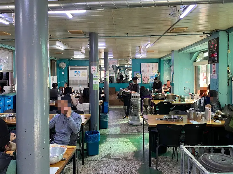 가게 내부 사진을 보면, 테이블과 의자는 평범하지만 깨끗하게 정돈되어 있다. 파란색 벽은 시원하고 청량한 느낌을 주며, 곳곳에 붙어있는 메뉴판과 안내문은 정겨운 분위기를 더한다. 손님들의 웃음소리와 이야기 소리가 들리는 듯한 활기찬 분위기는 이곳이 맛있는 음식을 즐기며 편안하게 시간을 보낼 수 있는 곳임을 보여준다.