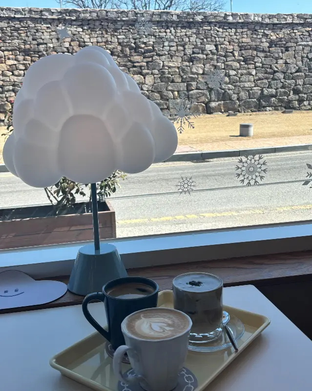 문을 열자 따스한 온기가 감돌았다. 은은한 조명 아래 아기자기한 소품들이 놓여 있었고, 카페 이름처럼 몽실몽실한 구름 모양의 조명이 눈길을 사로잡았다. 마치 동화 속 공간에 들어온 듯한 기분이었다. 벽 한켠에는 커다란 곰인형이 크리스마스 트리 옆을 든든하게 지키고 있었다. 커다란 창밖으로는 늠름한 해미읍성의 돌담이 펼쳐져 한 폭의 그림 같았다.