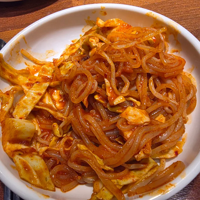 다음으로는 닭갈비를 맛볼 차례. 닭갈비 역시 숯불 위에서 서서히 익어갔다. 닭갈비는 삼겹살과는 또 다른 매력을 지니고 있었다. 매콤달콤한 양념이 닭고기 속까지 깊숙이 배어 있어, 젓가락을 멈출 수 없게 만들었다. 쫄깃한 쫄면 사리를 추가하여 함께 먹으니, 그 맛은 더욱 환상적이었다. 특히, 뜨거운 불판 위에서 살짝 눌어붙은 쫄면은 잊을 수 없는 별미였다.