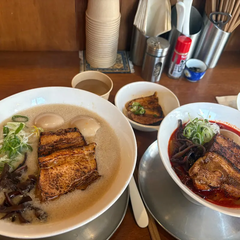 주문하고 얼마 안 돼서, 드디어 기다리고 기다리던 라멘이 나왔어! 비주얼부터가 장난 아니더라. 돈코츠 라멘은 뽀얀 국물에 차슈, 숙주, 계란이 듬뿍 올라가 있었고, 매운 돈코츠 라멘은 국물 색깔부터가 아주 얼큰해 보이는 게, 침샘을 자극하더라고.