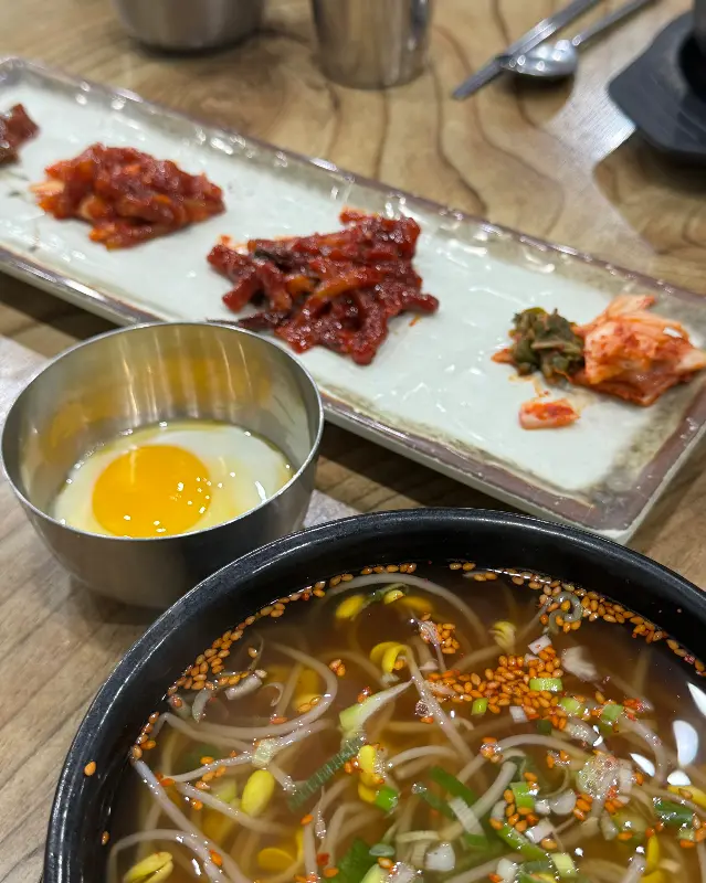 먹다 보니, 콩나물국밥에 숨겨진 비밀을 발견했다. 바로 수란이었다. 뜨거운 국물에 살짝 익은 수란은 콩나물국밥의 풍미를 한층 더 깊게 만들어줬다. 고소하면서도 부드러운 수란의 맛은 잊을 수 없을 것 같다. 다음에는 수란을 추가해서 먹어봐야겠다는 생각이 들었다.