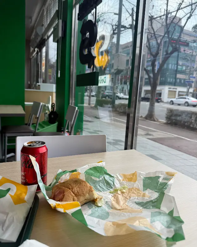 주문한 메뉴가 나오기 전, 가게 안은 손님들로 북적였다. 키오스크 두 대가 나란히 놓여 있었지만, 주문하려는 사람들로 줄이 끊이지 않았다. 창밖을 바라보니, 따뜻한 햇살이 나뭇잎 사이로 쏟아져 내리는 풍경이 눈에 들어왔다. 잠시 후, 드디어 진동벨이 울리고, 기다리고 기다리던 샌드위치가 내 손에 들어왔다.