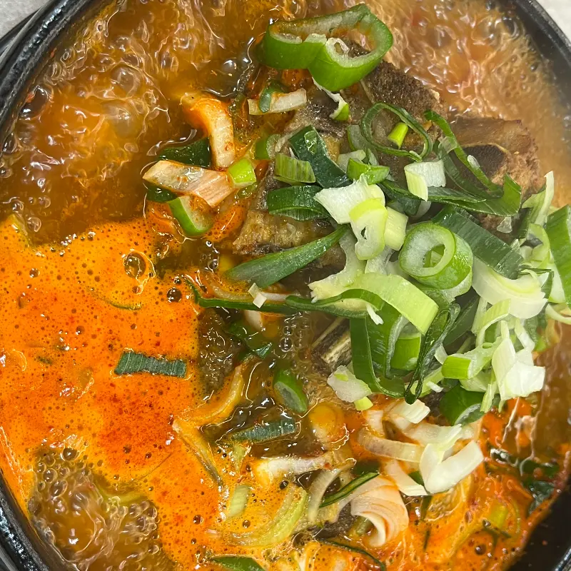 드디어 뼈해장국 등장! 뚝배기 안에서 보글보글 끓는 비주얼부터가 장난 아니었다. 얼큰한 냄새가 코를 찌르고, 뚝배기를 뚫고 솟아오를 듯 푸짐한 양에 입이 떡 벌어졌다. 사진에서 봤던 것처럼 파도 듬뿍 올라가 있어 먹음직스러웠다. 얼른 숟가락을 들고 국물부터 한 입 맛봤지.