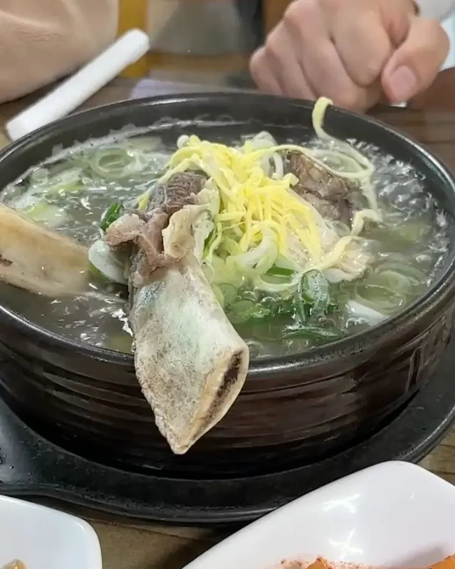 왕갈비탕: 가격은 16,000원. 큼지막한 갈빗대가 뚝배기 위로 솟아오른 모습이 압도적입니다. 갈비탕 안에는 당면과 송송 썰린 대파, 그리고 노란 지단이 고명으로 올라가 있습니다. 국물을 한 입 맛보는 순간, 깊고 진한 육향이 입안 가득 퍼집니다. 잡내 하나 없이 깔끔하면서도 시원한 국물 맛은 정말 일품입니다. 갈빗대에 붙은 살코기는 어찌나 부드러운지, 젓가락만으로도 쉽게 분리됩니다. 푹 고아진 갈비는 입에 넣는 순간 사르르 녹아내리는 듯한 식감을 자랑합니다. 특히, 이 집 깍두기와 배추김치와의 조합은 환상적입니다.