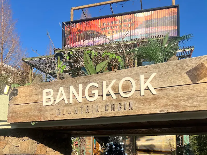 드디어 ‘방콕산장’ 입구에 섰다. 나무로 만든 간판에 큼지막하게 박힌 “BANGKOK MOUNTAIN CABIN”이라는 문구가 눈에 들어왔다. 간판 위쪽으로는 열대 식물들이 무성하게 자라고 있었고, 쨍한 햇빛 아래 그 모습은 마치 방콕의 어느 외딴 정글에 들어온 듯한 착각을 불러일으켰다. 간판 디자인에 사용된 폰트와 색감, 그리고 주변을 둘러싼 초록빛 식물들의 조화는 시각적으로 강렬한 인상을 남겼다. 이국적인 분위기를 연출하기 위한 세심한 노력이 엿보였다.
