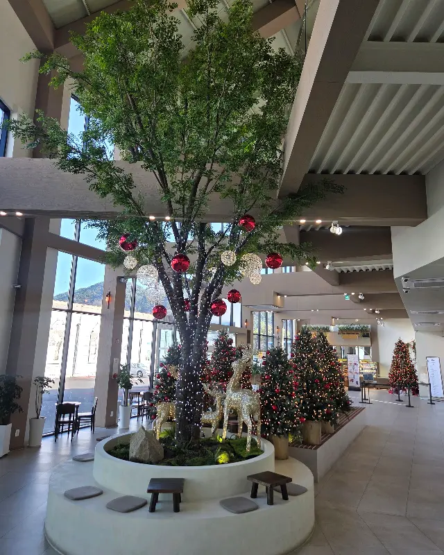 카페 내부는 더 대박이야. 층고가 엄청 높아서 시원시원한 느낌이고, 테이블 간 간격도 넓어서 답답함이 전혀 없어. 내가 갔을 때는 크리스마스 시즌이라 그런지, 거대한 트리 장식이 곳곳에 설치되어 있었어. 마치 숲 속에 들어온 듯한 착각이 들 정도였지. 특히 2층으로 올라가는 계단 쪽에 있는 대형 트리는 진짜 웅장하고 화려해서 사진 찍는 사람들이 엄청 많더라. 나도 질 수 없지! 인증샷 백만 장 찍었잖아. 📸 인생샷 건지기 딱 좋은 곳이야.