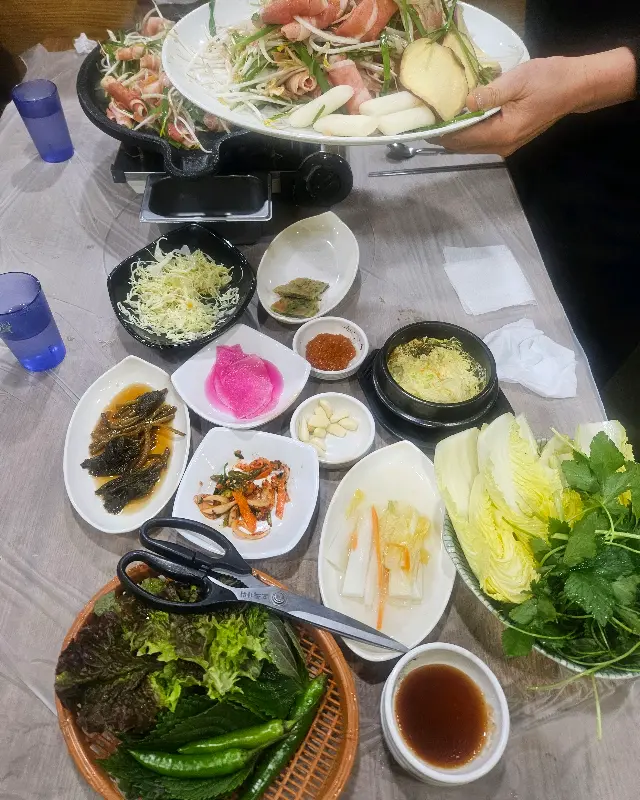 드디어 기다리고 기다리던 산더미 오리불고기가 등장했다. 접시 가득 담겨 나온 오리불고기의 붉은 자태는, 보는 이로 하여금 감탄을 자아내게 했다. 윤기가 자르르 흐르는 오리고기 위에는 신선한 깻잎과 팽이버섯이 듬뿍 올려져 있어, 시각적인 풍성함을 더했다. 불판 위에 오리불고기를 올리고, 지글지글 익어가는 소리를 들으니, 저절로 침이 꼴깍 넘어갔다.