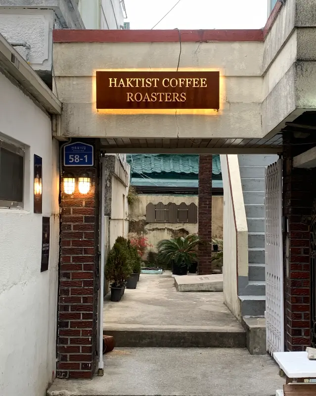 세월의 흔적이 느껴지는 외관, 학티스트 커피 로스터스의 입구