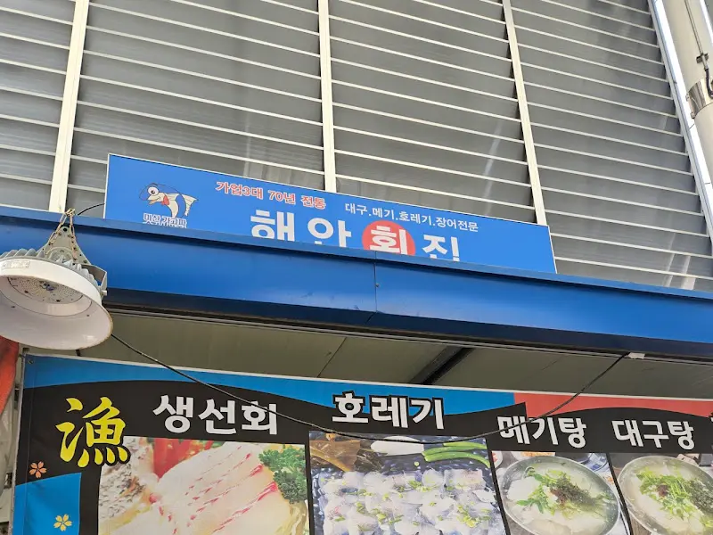 마산어시장 근처에 있다는 말만 듣고 갔는데, 파란 간판에 큼지막하게 ‘해안횟집’이라고 쓰여 있어서 찾기 쉬웠어. 간판 아래에는 싱싱한 해산물 사진들이 쫙 붙어있는데, 벌써부터 군침이 싹 도는 거 있지? 횟집 간판에는 ‘생선회, 호래기, 메기탕, 대구탕’ 메뉴가 적혀있어, 사계절 내내 맛있는 음식을 팔 것 같은 느낌이 팍 들었어.