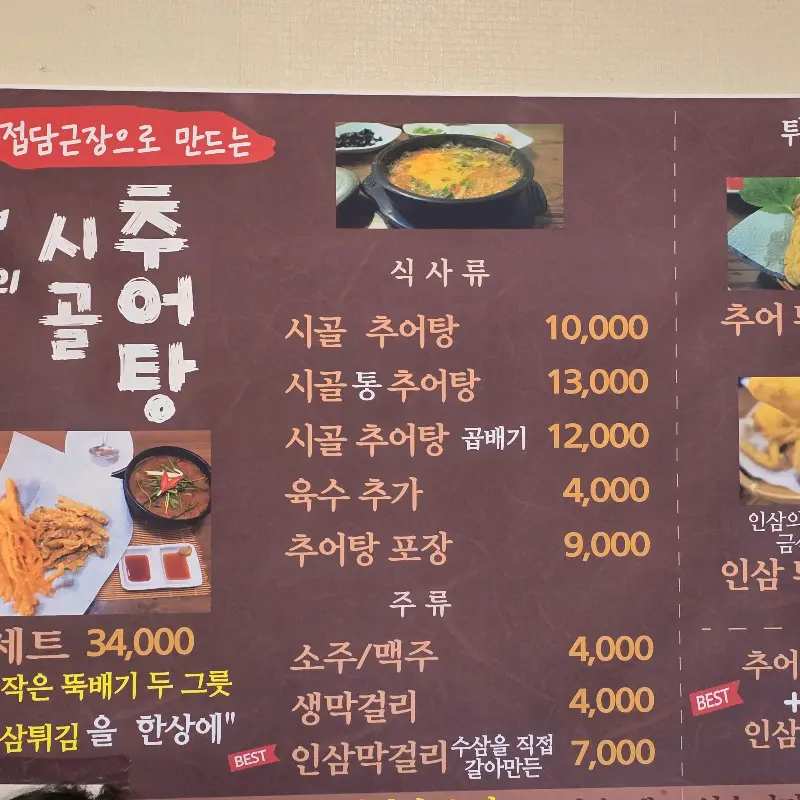 2인 보약세트 외에도 놓칠 수 없는 메뉴들이 있습니다. 바로 인삼 막걸리입니다. 금산은 인삼으로 유명한 지역이니만큼, 인삼 막걸리 또한 그 맛이 남다르다고 합니다. 특히 튀김과 함께 곁들이면 환상의 궁합을 자랑한다고 하니, 다음 방문 때는 꼭 맛봐야겠습니다. 메뉴판을 살펴보니, 시골추어탕 10,000원, 시골 통 추어탕 13,000원, 시골 추어탕 곱빼기 12,000원으로 가격도 합리적입니다. 육수 추가는 4,000원이며, 추어탕 포장은 9,000원에 가능하다고 하니, 집에서도 시골추어탕의 깊은 맛을 즐길 수 있습니다. 저는 특히 2인 세트(34,000원)의 구성이 마음에 들었습니다. 작은 뚝배기 두 그릇과 인삼튀김, 추어튀김을 한 번에 맛볼 수 있다는 점이 매력적입니다.
