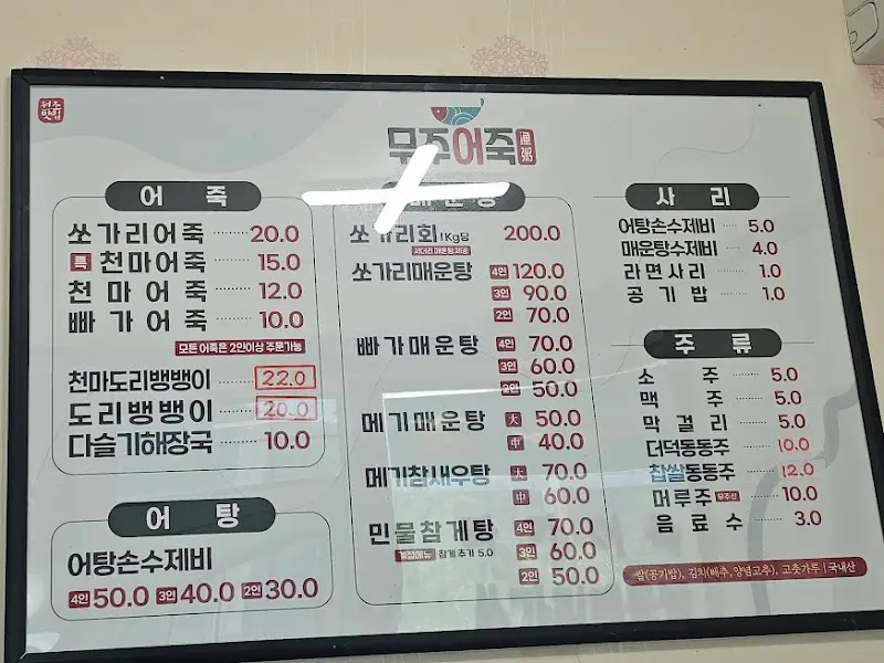 무주어죽 메뉴판