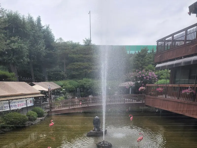 넓은 주차장에 차를 세우고 식당으로 향하는 길, 가장 먼저 눈에 들어온 것은 시원하게 솟아오르는 분수였다. 마치 작은 유원지에 온 듯한 기분. 분수 주변으로는 연못이 조성되어 있었고, 징검다리가 놓여 있어 운치를 더했다. 예전에는 잉어들이 헤엄치는 모습도 볼 수 있었다고 하는데, 아쉽게도 지금은 수달 때문에 볼 수 없다고 한다. 그래도 연못과 주변 조경은 충분히 아름다웠다.