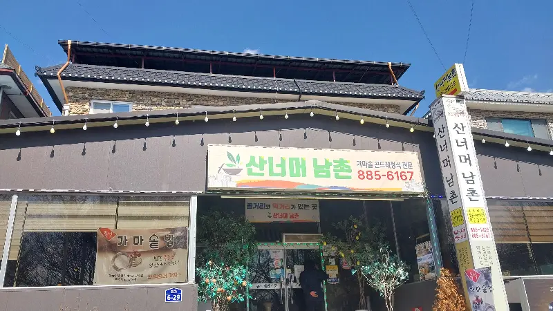 은 식당 외부 전경을 보여준다. ‘산너머남촌’이라는 간판과 함께, 주변 풍경이 어우러져 정겨운 분위기를 자아낸다. 식당은 꽤 넓어 보였고, 단체 손님을 위한 자리도 충분해 보였다. 실제로 많은 방문객들이 단체 모임 장소로 이곳을 추천하기도 한다. 넓은 공간과 다양한 메뉴는, 단체 손님들의 만족도를 높이는 데 기여하는 것으로 보인다.