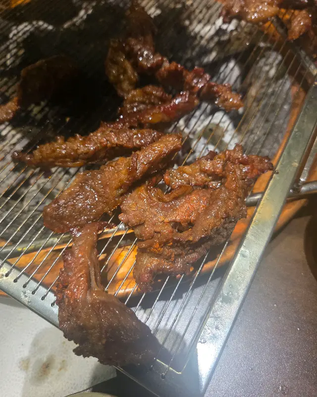 숯불 위에서 마이야르 반응이 제대로 일어난 양념 갈비살의 모습