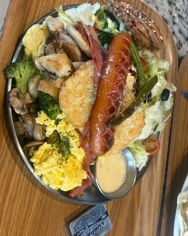 드디어 기다리고 기다리던 메뉴 등장! 미트 플래터 비주얼 진짜 미쳤다… 접시 가득 푸짐하게 담긴 샐러드, 구운 버섯, 닭가슴살, 베이컨, 소시지, 스크램블 에그, 빵까지! 종류도 다양하고 양도 엄청 많아서 보자마자 입이 떡 벌어졌다. 사진을 안 찍을 수가 없는 비주얼이었다. 인스타 스토리에 올리자마자 친구들한테 DM 폭발했다는 건 안 비밀.