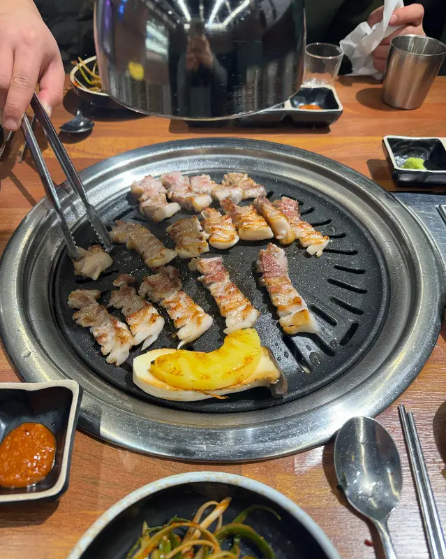 불판의 온도가 적정 수준에 도달하자, 직원분이 직접 고기를 올려 구워주셨다. 숙련된 솜씨로 고기를 뒤집고 자르는 모습은 마치 외과 의사가 수술 도구를 다루는 듯 정교했다. 를 보면 알 수 있듯이, 고기는 황금빛 갈색으로 변하며 맛있는 소리를 내기 시작했다. 160도에서 발생하는 마이야르 반응은 아미노산과 환원당이 반응하여 수백 가지의 풍미 화합물을 생성한다. 이 과정을 통해 고기 표면에는 먹음직스러운 갈색 크러스트가 형성되고, 특유의 고소한 향이 퍼져 나간다.