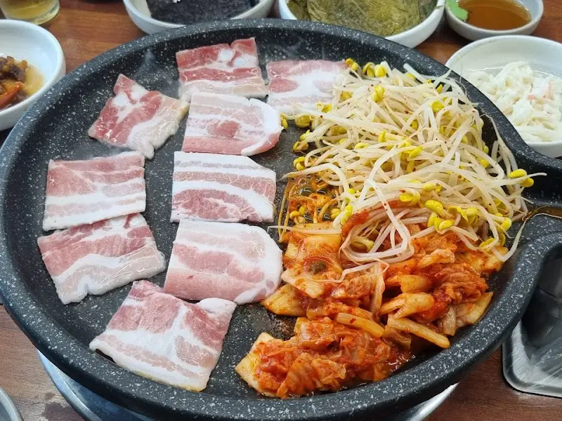 함께 제공된 돼지고기는, 갈미조개의 맛을 더욱 풍성하게 만들어 주었다. 돼지고기의 지방은 갈미조개의 담백함을 감싸 안아, 입안에서 부드럽게 녹아내리는 듯한 느낌을 선사했다. 160도에서 마이야르 반응이 일어나며 돼지고기 표면에 형성된 갈색 크러스트는, 고소한 풍미를 더해 미각을 자극했다. 갈미조개와 돼지고기, 이 둘의 만남은 마치 운명처럼 완벽했다. 과 3을 보면, 갈미조개, 돼지고기, 김치, 콩나물이 함께 구워지는 모습을 볼 수 있다. 이 조합은 맛의 시너지를 극대화하여, 젓가락을 멈출 수 없게 만든다.