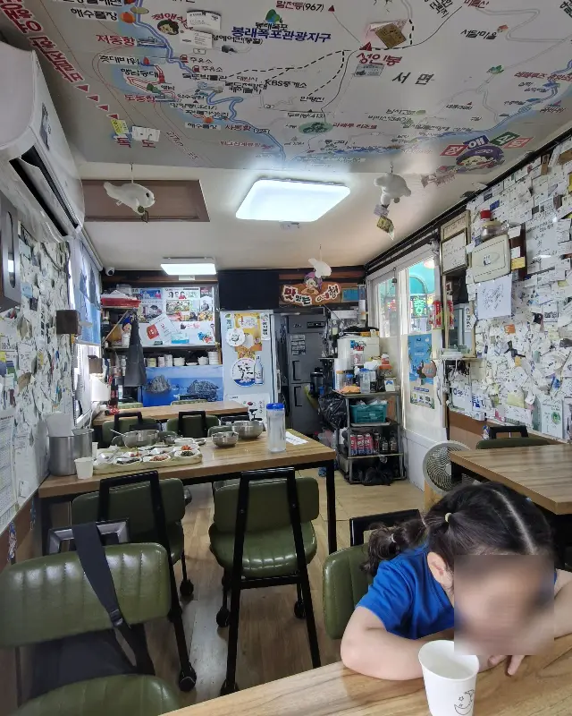 저동항에 딱 내리자마자, 친절한 사장님 덕분에 첫인상부터 완전 좋았던 곳. 작은 가게지만, 그 안에 담긴 맛은 정말 어마어마하더라. 아침 일찍 서둘러 배를 탔더니 배도 너무 고프고… 얼른 들어가 자리를 잡았다. 벽에는 다녀간 사람들의 명함이 빼곡하게 붙어있는게, 진짜 맛집 스멜이 팍팍 느껴지더라.