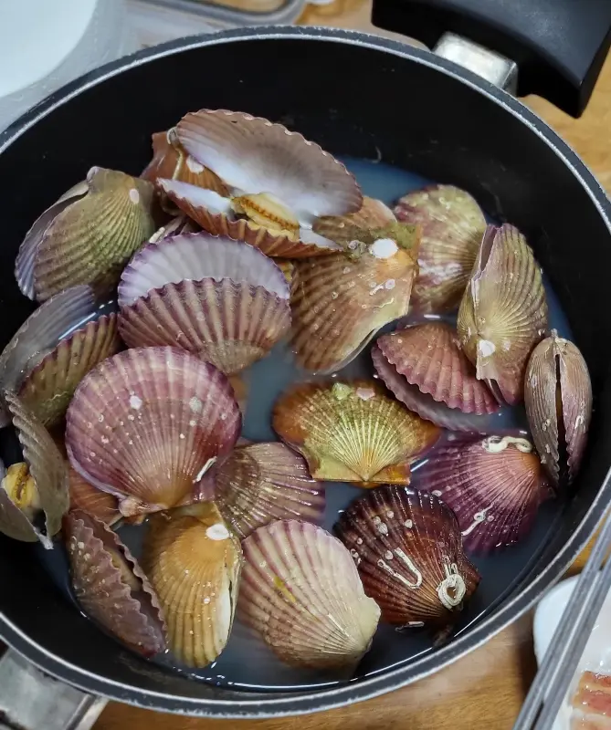 김이 모락모락 나는 냄비 안에는 알록달록한 가리비들이 가득 담겨 있었다.