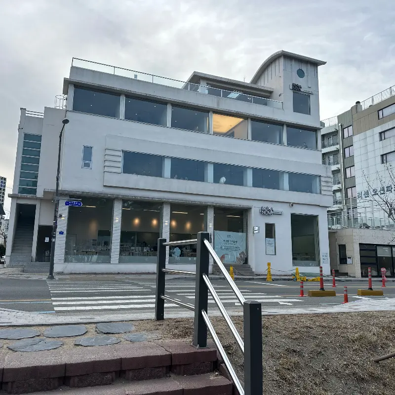 카페에 가까워질수록 점점 더 크게 보이는 건물이 눈에 띄었습니다. 4층까지 있는 꽤 큰 규모의 카페였는데, 멀리서 봐도 통유리창 너머로 보이는 바다 풍경이 가슴을 탁 트이게 했습니다. 주차장도 넓어서 편하게 주차할 수 있었지만, 1시간 30분 무료라는 안내 문구가 살짝 아쉬웠습니다. 뭐, 맛있는 커피와 빵을 즐기다 보면 시간 가는 줄 모를 테니 괜찮겠지 싶었습니다.