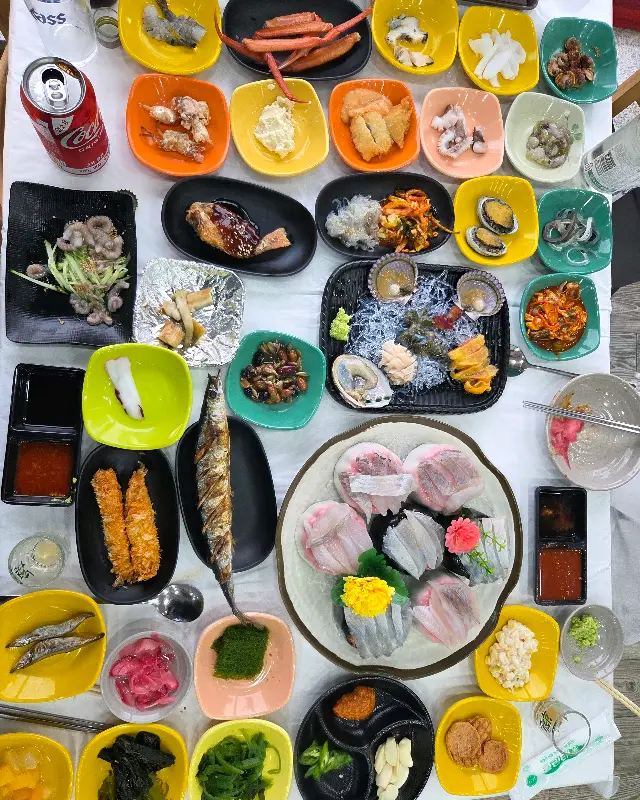 주문을 마치자, 곧바로 밑반찬들이 쉴 새 없이 쏟아져 나왔다. 마치 작은 잔치상이 차려진 듯, 테이블 위는 순식간에 알록달록한 접시들로 가득 찼다. 멍게, 전복, 산낙지, 새우, 소라 등 신선한 해산물은 물론이고, 샐러드, 튀김, 볶음 요리 등 다채로운 메뉴 구성에 입이 떡 벌어졌다. 마치 보석을 박아놓은 듯한 비주얼은, 보는 것만으로도 황홀경에 빠지게 했다. 젓가락을 어디에 먼저 둬야 할지 행복한 고민에 빠진 것도 잠시, 갓 잡은 듯 싱싱한 해산물들의 향긋한 바다 내음이 코끝을 간지럽혔다.