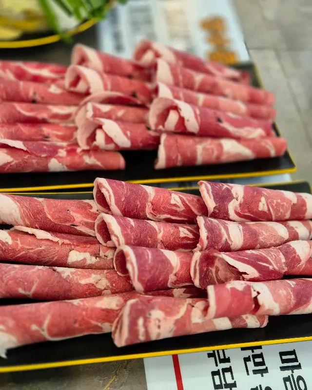 고기는 소고기, 양고기, 삼겹살 중에서 선택할 수 있었는데, 나는 훠궈와 가장 잘 어울린다는 양고기를 선택했다. 주문 즉시 얇게 썰어 나오는 양고기는 신선함이 남달랐다. 붉은 빛깔의 윤기가 흐르는 양고기는 보기만 해도 군침이 돌았다. 얇게 썰린 덕분에 훠궈 육수에 살짝만 담가도 금방 익어, 오랫동안 기다릴 필요 없이 바로 맛볼 수 있다는 점도 마음에 들었다. 개인적으로 돼지고기를 즐겨먹지만, 훠궈만큼은 양고기가 진리라고 생각한다. 특유의 풍미가 훠궈의 깊은 맛과 어우러져 환상의 조합을 만들어내기 때문이다.