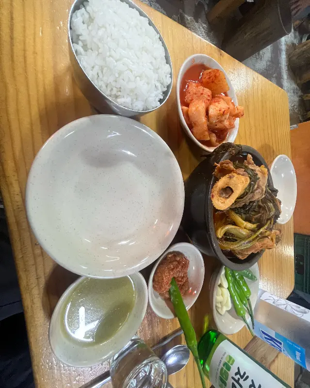 진한 갈색 국물 위로 우거지와 큼지막한 뼈가 넉넉하게 담겨 있었다. 뽀얀 쌀밥과 잘 익은 깍두기, 그리고 고추와 쌈장이 함께 나왔다. 먼저 국물부터 한 모금 맛보았다. 깊고 진한 육향이 입안 가득 퍼졌다. 칼칼하면서도 짜지 않은, 절묘한 밸런스를 이루는 국물이었다. 돼지 사골을 오랜 시간 정성껏 우려낸 듯, 깊은 풍미가 느껴졌다. 이 집만의 비법 육수가 분명하리라.
