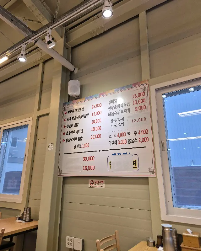 식당 내부는 생각보다 훨씬 넓었다. 테이블 간 간격도 넉넉해서 편안하게 식사를 즐길 수 있는 분위기였다. 은은하게 퍼지는 조명은 음식에 대한 기대감을 한층 높여주었다. 자리에 앉아 메뉴판을 살펴보니, 비빔밥, 갈비탕, 냉면 등 다양한 한식 메뉴가 눈에 띄었다. 굴비의 도시답게 굴비 메뉴도 있었지만, 오늘은 동료가 극찬했던 비빔밥을 ‘실험’해 보기로 결정했다.