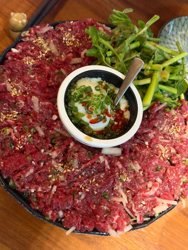자리에 앉자, 직원분이 따뜻한 미소로 메뉴판을 건네주셨다. 메뉴판을 펼치자, 눈길을 사로잡는 것은 단연 ‘기술한상’이었다. 신선한 육회와 뭉티기, 육사시미를 한 번에 맛볼 수 있다는 설명에 망설임 없이 주문했다. 잠시 후, 화려한 비주얼을 자랑하는 기술한상이 내 눈 앞에 펼쳐졌다.