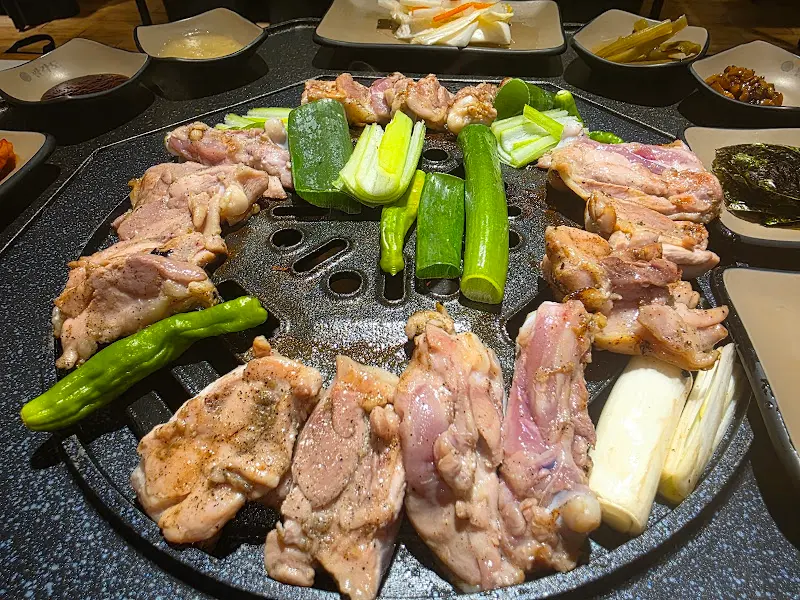 자리에 앉으니 숯불이 활활 타오르는 팔각 모양의 불판이 눈에 띄었어. 어찌나 신기하던지! 젊은 친구들은 이런 데서 사진도 많이 찍는다던데, 나도 질 수 없지. 얼른 카메라를 꺼내 찰칵찰칵 찍어뒀다니까. 불판 위에 닭갈비를 올리니, 치이익 소리와 함께 맛있는 냄새가 코를 찔렀어. 아, 이 냄새, 정말 참을 수 없구먼!