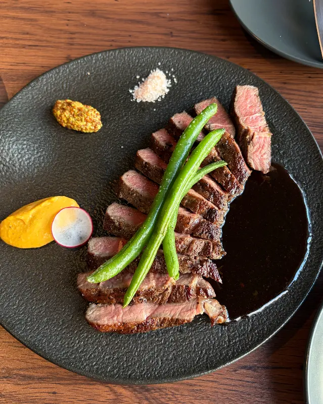 사진에서 볼 수 있듯이, 스테이크는 먹기 좋은 크기로 슬라이스되어 검은색 접시에 담겨 나왔다. 짙은 색의 스테이크 소스가 한 켠에 자리하고 있고, 그 위로 신선한 녹색 채소가 얹어져 색감의 조화가 뛰어났다. 곁들여진 겨자와 퓨레, 소금은 스테이크의 맛을 더욱 풍부하게 만들어주는 역할을 했다. 겉은 살짝 노릇하게 구워졌지만, 속은 촉촉한 핑크빛을 띠고 있어 완벽한 굽기임을 짐작할 수 있었다. 한 입 베어 무는 순간, 입 안 가득 퍼지는 육즙과 부드러운 식감은 감탄을 자아내기에 충분했다.