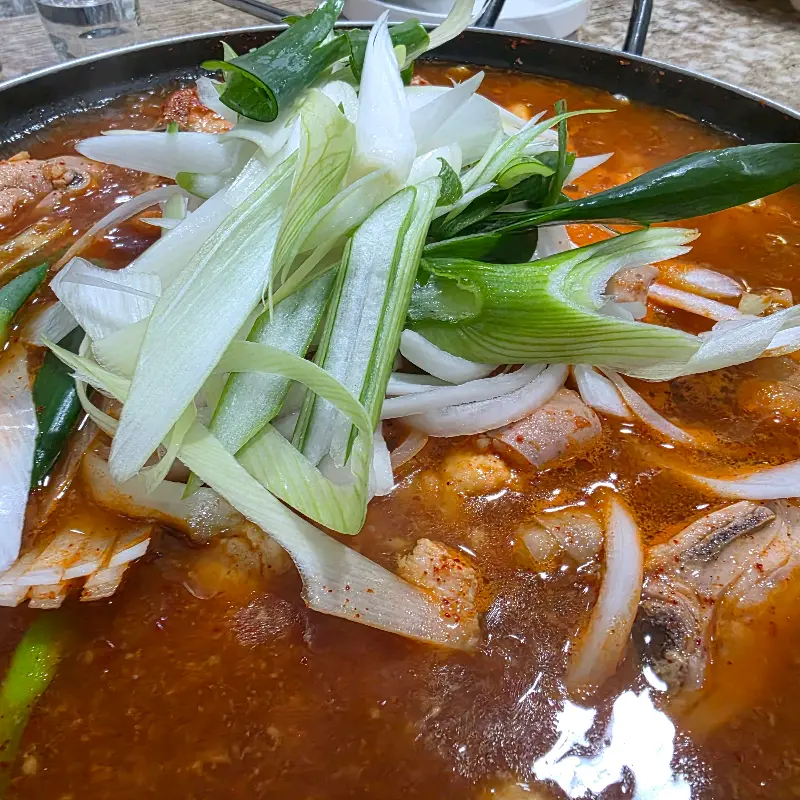 드디어 기다리고 기다리던 곱도리탕이 나왔어. 냄비 가득 담긴 뽀얀 국물 위에 곱창, 닭고기, 감자, 양파, 파채가 듬뿍 올라간 모습이 어찌나 먹음직스럽던지. 사진으로만 봐도 그 푸짐함이 느껴지지? 냄새도 얼마나 좋던지, 얼른 한 숟갈 떠먹고 싶어서 혼났어. 특히나 눈에 띄는 건, 큼지막하게 썰어 넣은 파채였어. 파 특유의 시원한 향이 곱도리탕의 느끼함을 잡아줄 것 같다는 기대감이 들었지.