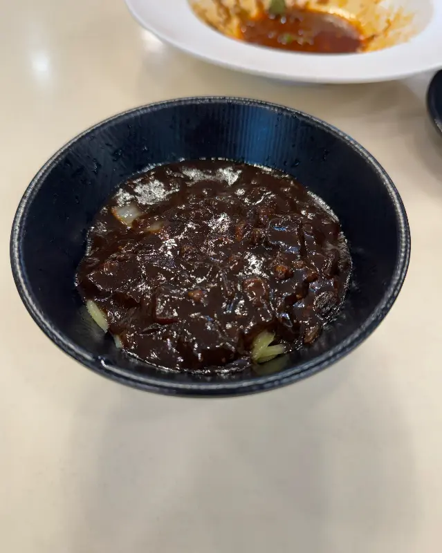 젓가락으로 면을 휘휘 저어서 짜장 소스를 듬뿍 묻혀 한 입 먹는 순간… 이거 완전 미쳤다! 짜장 소스가 진짜 짜지도 않고, 그렇다고 너무 달지도 않고 딱 적당해. 해물 향도 은은하게 나는 게, 진짜 중독성 있는 맛이야. 면발도 얇아서 그런지 소스가 겉돌지 않고 착 감기는 느낌!