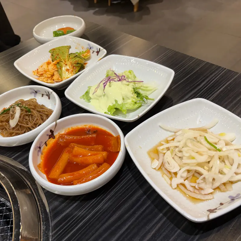 반찬 하나하나에서 정성이 느껴졌습니다. 신선한 샐러드, 아삭한 물김치, 매콤한 겉절이 등 다채로운 구성은 입맛을 돋우기에 충분했습니다. 특히, 슴슴하면서도 시원한 물김치는 갈비와 환상적인 조화를 이루며, 입안을 깔끔하게 정리해주는 역할을 했습니다. 아이들을 위해 준비된 멸치볶음과 계란찜 역시, 짜지 않고 부드러워 아이들의 입맛을 사로잡았습니다. 밑반찬만으로도 이 집의 음식 솜씨를 짐작할 수 있었습니다.