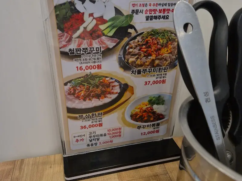 자리에 앉아 메뉴판을 살펴보니, 쭈꾸미 볶음을 기본으로 차돌 쭈꾸미, 철판 쭈꾸미 등 다양한 메뉴가 준비되어 있었다. 잠시 고민 끝에, 이곳의 대표 메뉴인 쭈꾸미 볶음과 차돌 쭈꾸미를 주문했다. 메뉴판 사진 속 쭈꾸미의 탱글탱글한 자태가 어찌나 먹음직스럽던지, 빨리 맛보고 싶은 마음뿐이었다.