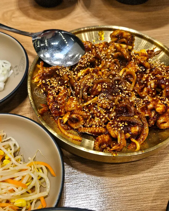 드디어 쭈꾸미 볶음 등장! 놋으로 된 접시에 담겨 나오는데, 윤기가 좔좔 흐르는 비주얼에 넋을 잃었다. 쭈꾸미 위에는 깨가 솨르륵 뿌려져 있어, 마치 무대 위 래퍼의 블링블링한 액세서리 같았다. 불향이 코를 찌르는데, 이건 완전 향기 테러 수준!