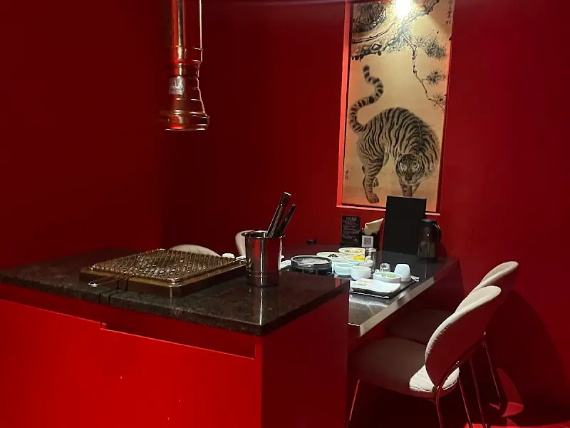 건물 지하에 주차를 하고 엘리베이터를 타고 올라가니, 웅장하면서도 세련된 분위기가 시선을 압도한다. 은은한 조명 아래 고급스러운 인테리어가 펼쳐지고, 직원분들의 친절한 안내를 받으며 예약된 룸으로 들어섰다. 붉은색 벽이 강렬한 인상을 주는 그곳은, 마치 비밀스러운 아지트 같은 느낌을 자아낸다. 벽 한쪽에 걸린 호랑이 그림은 붉은 공간을 더욱 특별하게 만들어준다. 테이블 위에는 반짝이는 스테인리스 물통과 가지런히 놓인 식기들이 놓여 있었다.
