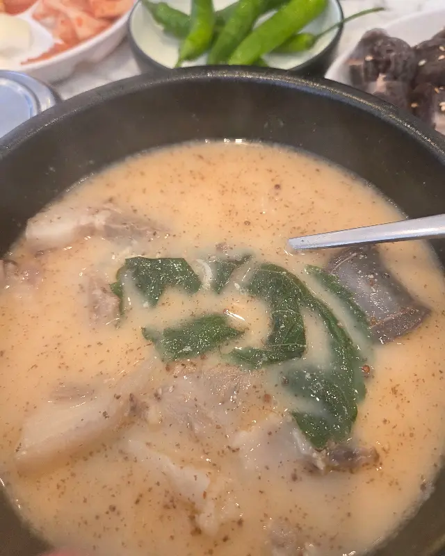 순대국밥의 첫인상은 뽀얀 국물과 푸짐한 건더기였다. 들깨가루가 듬뿍 뿌려져 있어 고소한 향이 코를 자극했다. 국물을 한 숟갈 떠서 입에 넣으니, 깊고 진한 사골 육수의 풍미가 입안 가득 퍼져 나갔다. 돼지 특유의 잡내는 전혀 느껴지지 않았고, 깔끔하면서도 깊은 맛이 일품이었다. 40년 전통의 비법 육수라는 말이 실감 나는 순간이었다.