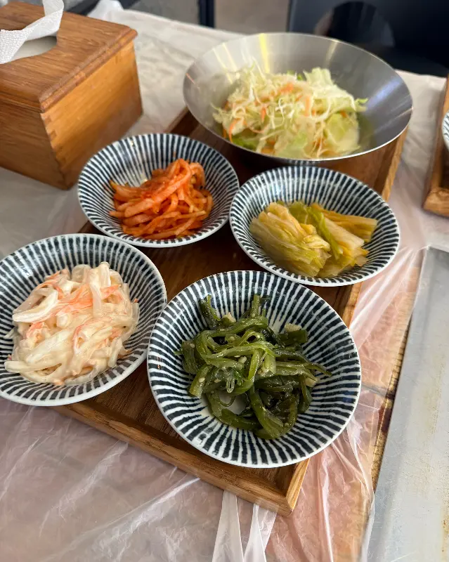 주문하고 얼마 지나지 않아 밑반찬이 쫙 깔리는데, 와… 진짜 푸짐하다는 말로는 부족하다. 샐러드부터 시작해서 각종 곁들임 반찬들이 테이블을 가득 채우는데, 하나하나 정성이 느껴지는 맛이었다. 특히 저 새콤달콤한 부추무침! 곱창이랑 같이 먹으면 진짜 환상의 궁합이다. 깻잎장아찌도 완전 내 스타일!